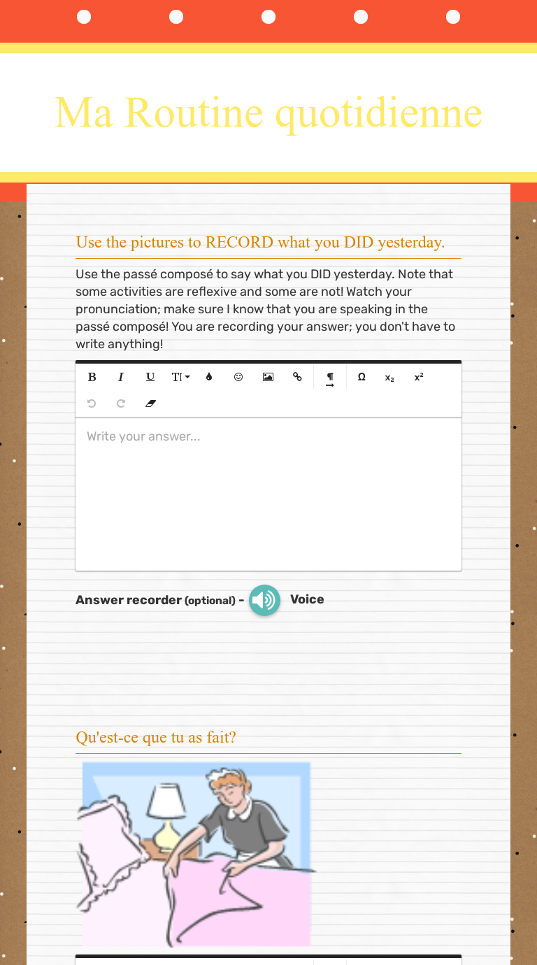 Complete each sentence with the correct formThis PPT lesson along with its booklet will help you teach in French about the daily routine with grammar and fun gamesHere, you will listen to a man talking about his daily routine in French He will tell you information about daily activities, also telling you at what time